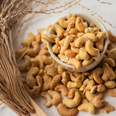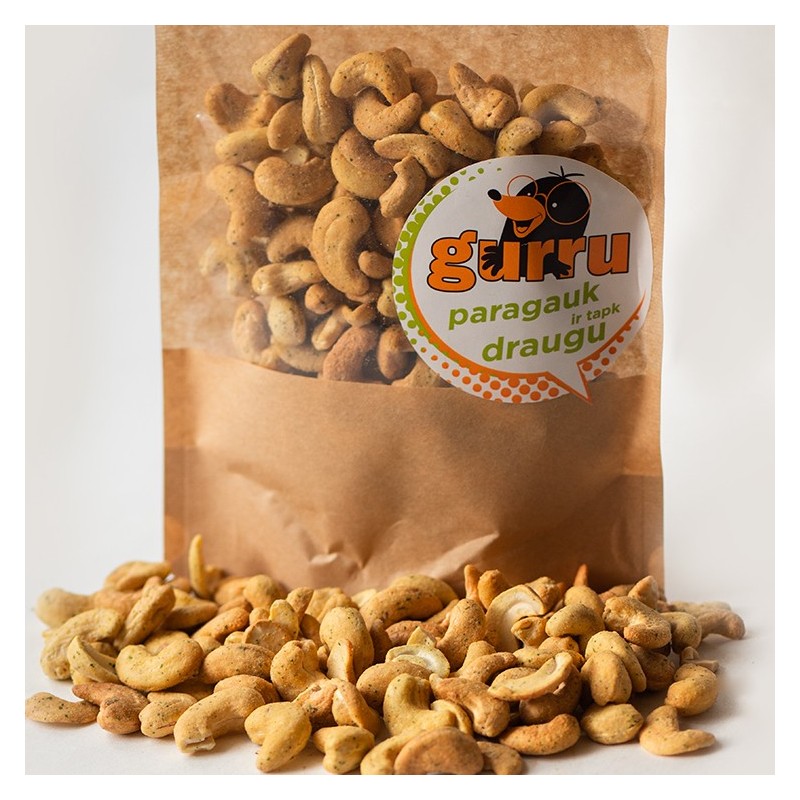 Subtiliai traškūs anakardžio riešutai švelnaus grietinės ir svogūnų skonio. Šiek tiek paskrudinti ir apvilkti klasikiniu skonių deriniu nepaliks abejingų. Tiesiog neįmanoma sustoti kramsnoti